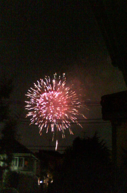 近くで花火大会があって、家の窓からがんばって体を伸ばして、しばし闇に咲く花に見入りました。